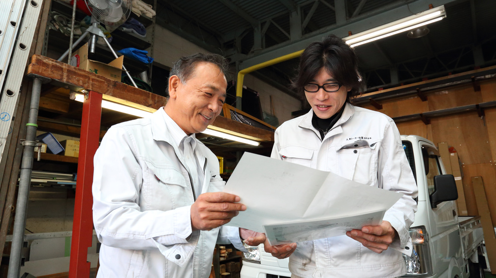 仕事上で嬉しいことは、お客様が喜んで下さること、そして、取り付け工事が、想像していたとおりに上手くできたときですね。「上手く」とは、折り鶴でいうなら、1回できれいに折れた、という感じです。「きれいに折れて良かったな」という嬉しさです。技術において上を目指せば、まだまだありますが、お客様から「きれいね」「助かったわ」と喜びの言葉をいただいたら、「まあ、ヨシとしよう」と自己評価しています。お客様と直接話せると、反応が見られて、やりがいにつながりますね。「こうするとつまずきにくいですよ」など、自分なりの提案が反映されるところにもやりがいを感じます。